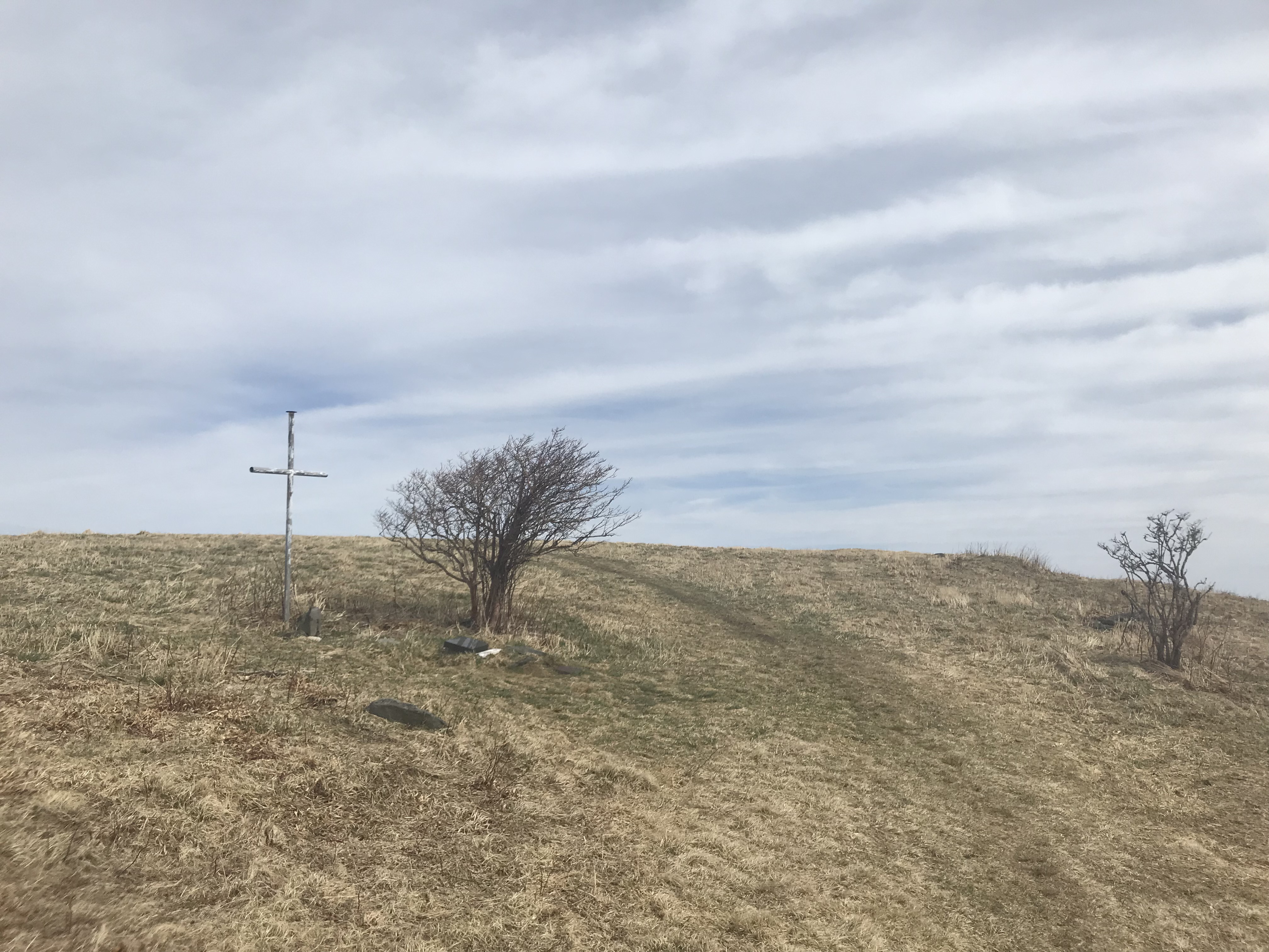 The trail is really an access road that is not really maintained as there was plenty of brush and tree blowdowns throughout the 1.25 mile climb it takes to summit the knob. This day the trail was really wet and was almost washed out in places. This isn’t a problem if you are wearing proper footwear but be advised regardless. The climb takes you to a smaller but good sized bald first before eventually reaching the larger Knob/Bald. As you reach the final destination you will pass a grave that is marked with a very large cross. Once at the top of this Bald, soak in the sunshine and gaze in the almost 360 degree view of mountains around as you can easily point out and follow the Cherohala Skyway snaking around the immediate areas of Hooper Bald and Huckleberry Knob.